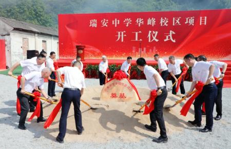瑞安市領(lǐng)導(dǎo)秦肖、應(yīng)?恕⑹┚抟、李輔正等,以及華峰集團董事局主席尤小平、總裁林建一,瑞安中學(xué)校長王安國等出席開工儀式,并共同為項目開工建設(shè)培土奠基。