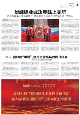 9月7日上午,隨著響亮的開市鑼聲響起,上海華峰鋁業(yè)股份有限公司(股票簡稱:華峰鋁業(yè),股票代碼:601702)在上交所主板成功掛牌上市。這也是我市華峰集團繼華峰氨綸、華峰超纖之后,培育出的第3家上市公司。華峰集團也由此成為了溫州本土擁有上市公司最多的企業(yè)集團。
