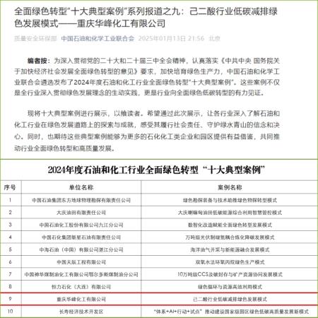 1月13日,中國石化聯(lián)合會官方微信公眾號刊發(fā)了2024年度石油和化工行業(yè)全面綠色轉(zhuǎn)型“十大典型案例”之九——重慶華峰化工“己二酸行業(yè)低碳減排綠色發(fā)展模式”,向社會公眾展示了華峰化工在綠色發(fā)展道路上的探索與成就,以及在履行社會責(zé)任、守護綠水青山的信念和決心。